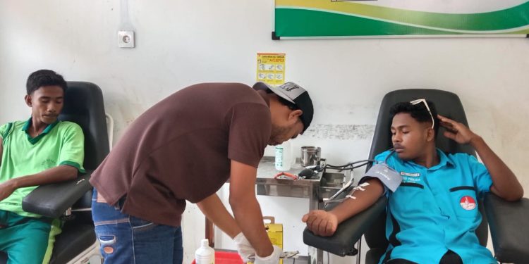 Pantauan Mediaflores,news pada hari Jumad tanggal 1 Maret 2024 Pukul 10.00 Wita, di ruang kerja Palang Merah Indonesia (PMI) yang terletak di rumah sakit Aeramo. Anjelo Bule dan Juan Sara dengan menggunakan kostum pelajar tengah mendonorkan darah.